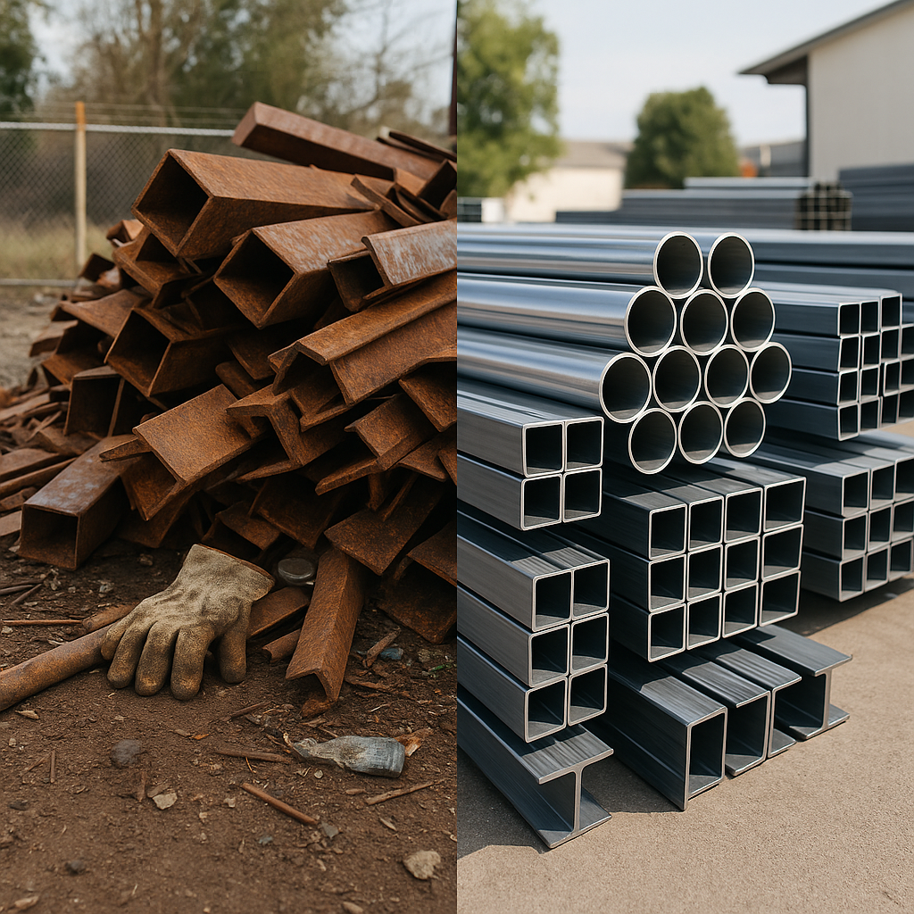 Split screen image showing piles of rusted steel waste on one side and shiny new steel products made from recycled materials on the other.